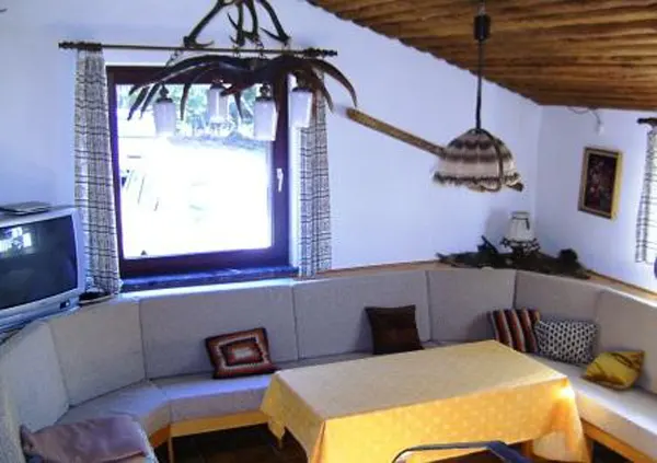 Im Erdgeschoss befinden sich die sanitären Anlagen (Duschen, Waschräume und WC´s) sowie ein Aufenthaltsraum für ca. 30 Personen, die Bauernstube für ca. 12 Personen, das Jägerzimmer (Fernsehraum), ein Telefonzimmer und die Küche.